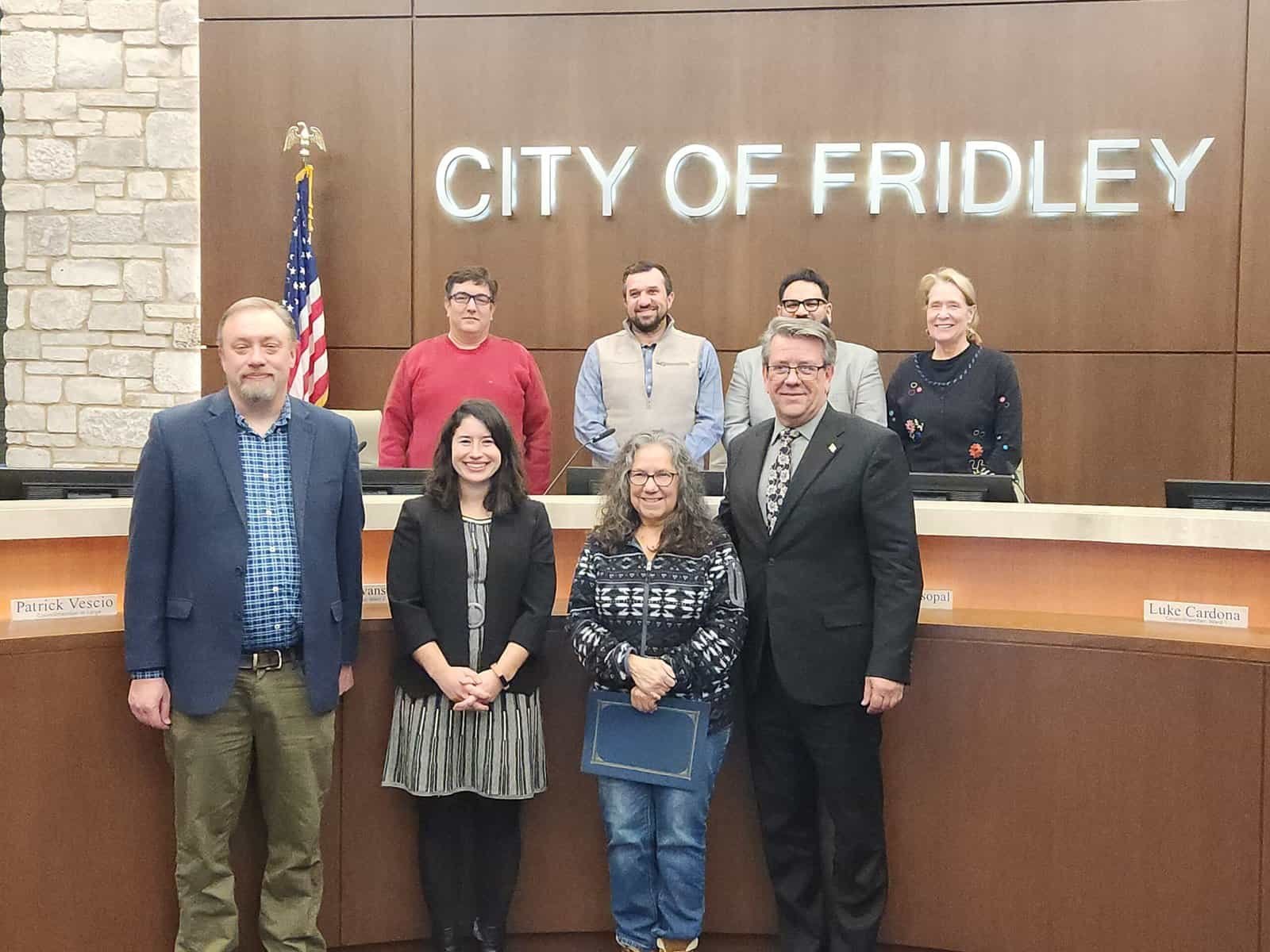 Natividad Seefeld, President of Park Plaza Cooperative (pictured front row, third from the left) poses with officials from the City of Fridley after accepting the award on the Co-op’s behalf.